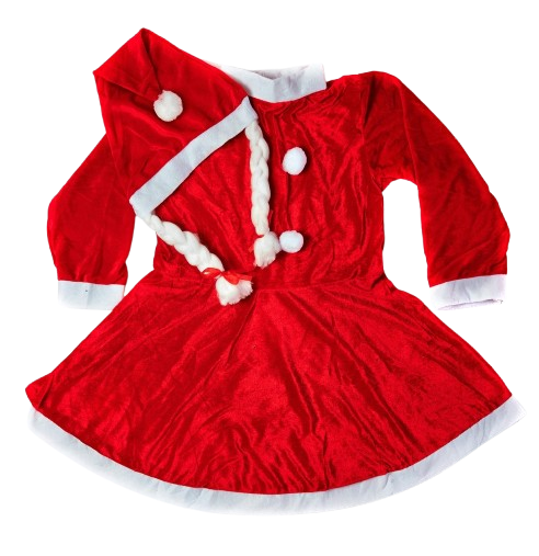 Charming Santa Dress: A festive, flared dress made from soft, high-quality [Material, velvet-touch fabric] in vibrant red, accented with fluffy white trim on the hem and cuffs.