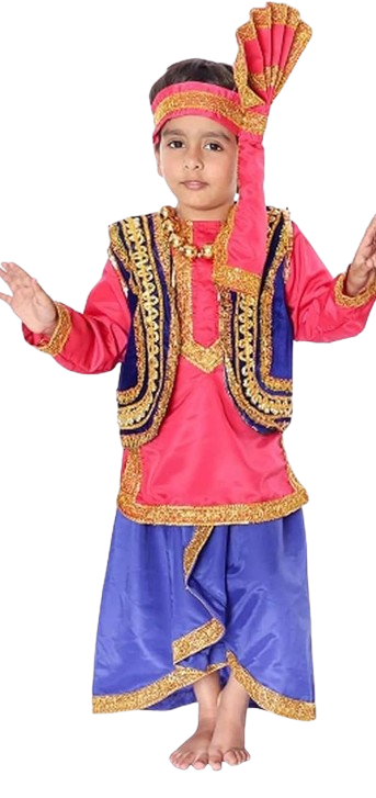 The traditional Punjabi boy’s costume typically features a Kurta, often paired with a Pajama or sometimes a Dhoti/Salwar. A crucial and iconic element for a complete Punjabi boy’s look is the Turban (Pagri), signifying pride and heritage.