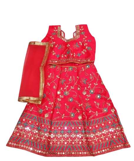 Each set features a beautifully crafted lehenga (skirt), often adorned with traditional motifs, delicate embroidery, or vibrant prints that reflect the spirit of devotion. It’s paired with a complementing choli (blouse) and a graceful dupatta (scarf), completing the authentic traditional look. Made from comfortable, high-quality fabrics, this Radha Lehenga allows for graceful movement and comfortable wear, ensuring your little one (or yourself) radiates peace and beauty throughout any celebration.
