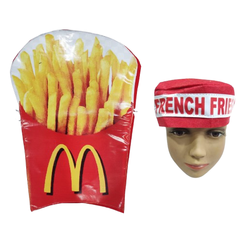 Get ready to bring some salty, golden goodness to your next fancy dress event with our Fry-tastic French Fries Costume Set! This deliciously fun kit features a vibrant flex printed cutout of a cheerful box of golden French fries, perfectly capturing that irresistible crispy appeal. To complete your savory transformation, we’ve included a matching cap boldly embroidered with “FRENCH FRIES”, ensuring everyone knows exactly what tasty treat you are!