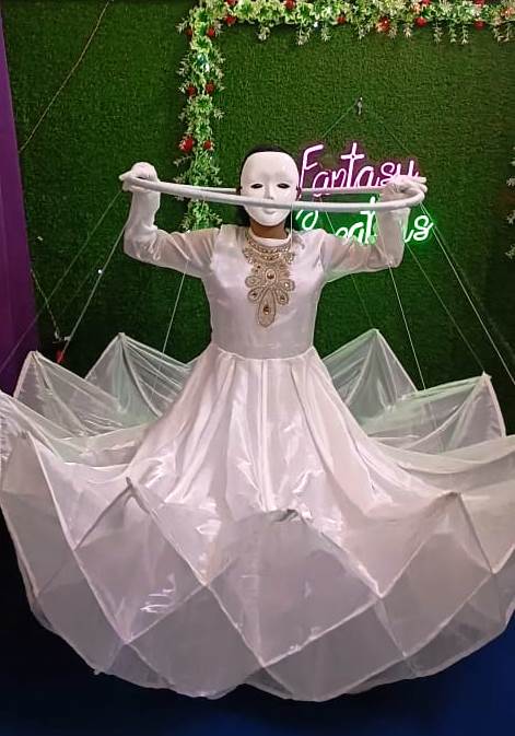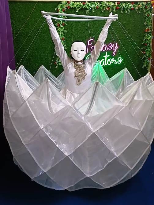 • Dramatic Transformation: The multi-paneled skirt is constructed with an internal, lightweight frame that is controlled by the wearer via a manual hoop mechanism (held in the hands). The skirt can be extended outward into a wide, circular bloom or pulled upward into a high, closed flower bud/dome shape.